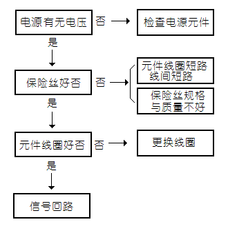 (2)在自動循環中,進入充料工序,但沒有吹料動作,手動檢查發現吹料閥不動作,作如下檢修:→+24V電源好→+24v保險絲好→用萬用表測量吹料電磁閥線圈,→線圈燒毀,→更換線圈 。